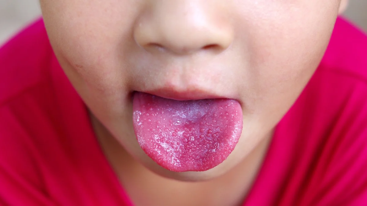 limbă „zmeurie” (roșie, cu papile gustative mărite);